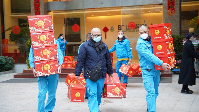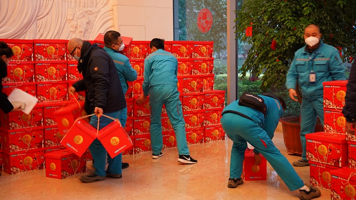 兔年将至,备年礼、囤年货都是必不可少的仪式。一件件代表着公司关怀的年货堆成一座座小山,承载了公司对每一位员工真挚的问候与祝福,红色的包装更为发年货现场增添了喜庆、热闹的氛围感。