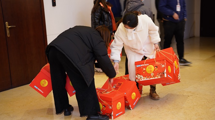 在所有年货到位之后,各公司员工来到一楼大厅,满怀激动的心情领取年货。“快快快,点一下。”“你帮忙多拿几个,一起上去!”“这个不错,我喜欢吃。”年货发放现场气氛热烈,大家提着沉甸甸的年货,脸上洋溢着笑容,新春佳节的喜悦已萦绕在公司内外。