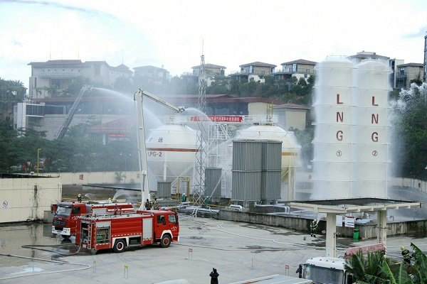 为进一步加强安全生产应急管理工作,提高燃气泄漏突发事故的应急处置能力,检验罐区消防设施的有效性,最大限度地减少燃气泄漏事故及其造成的人员伤亡和财产损失, 2015年12月10日下午四时许,旷远能源联合莆田市住建局、市公安局、市质监局、市消防支队、霞林派出所、莆田电视台等单位,在城厢气化混气灌瓶站共同组织开展“液化石油气泄漏事故应急演练”。旷远能源总经理叶春、副总经理黄剑锋、副总经理胡惠、总助陈丽群、总助施伟江及相关部门主管均到达现场全程参与演练,全市11家燃气企业代表获邀至现场观摩。