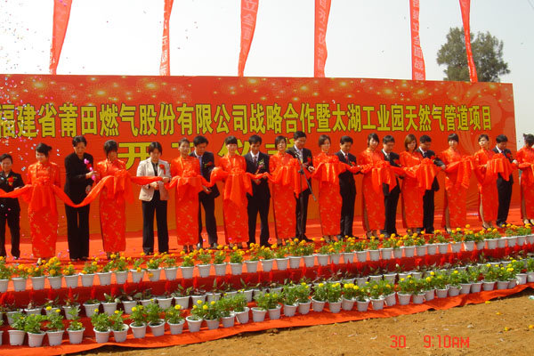 莆田燃气公司于2010年4月30日在城厢区太湖工业园就天然气管道项目举行了隆重的开工仪式,剪彩的有城厢区五套班子、区委书记、区委副区长、旷远集团副总裁魏文喜等领导。目前太湖工业园区共招商10多家工业用户,为我司后期提升燃气销售增长点提供了良好的开端。
