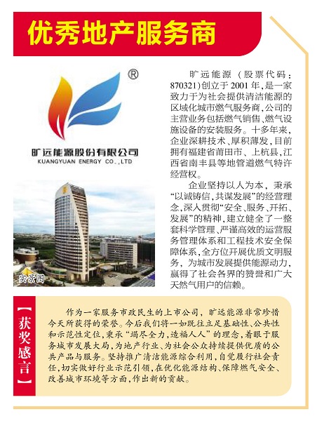 1月20日下午,在福州三坊七巷中瑞剧坊,由全国房地产商会联盟、中国主流媒体房地产宣传联盟全程指导,福建房地产主流媒体联盟主办的“2017中国房地产荣誉榜暨第五届福建地产年会颁奖盛典”圆满落幕。旷远能源凭借自身在地产行业服务与价值创造方面的突出表现,获得唯一“优秀地产服务商”大奖,民生服务价值获行业权威认可。在颁奖环节,旷远能源代表对主办方的积极努力和取得的丰硕成果表达了感谢,并表示“..